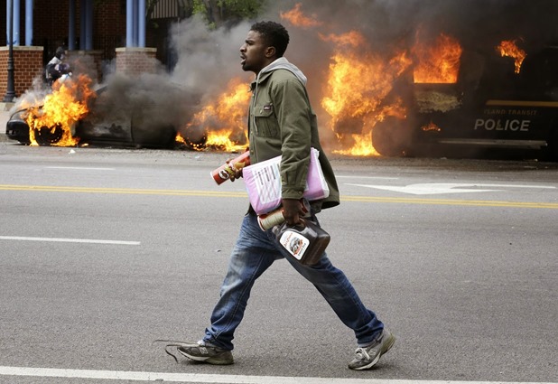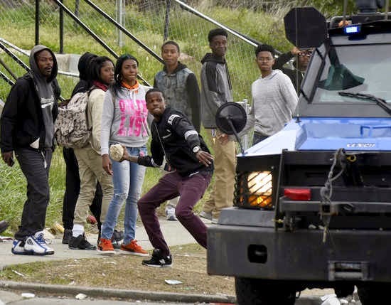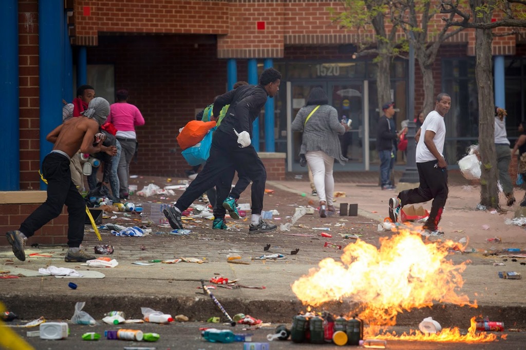 Protesters milled in the middle of intersections devoid of traffic and chatted with police officers in riot gear; workers cleaned up debris left by the rioting; and televisions showed the Orioles playing baseball in an empty stadium, kept clear of fans for security reasons. Most surreal of all was the image of armed National Guard troops in camouflage-painted vehicles joining the police in patrolling the city.