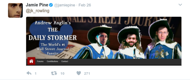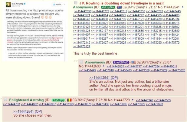 Needless to say, at this point Rowling is getting roasted pretty badly from all corners of the internet. Her twitter is basically an unrelenting assault from a mix of PewDiePie fans and Nazi Trolls from the Stormer and /pol/.