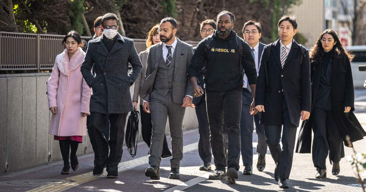 They and their legal team arrived at Tokyo District Court around midday and spoke to media outside before heading in to file their case.