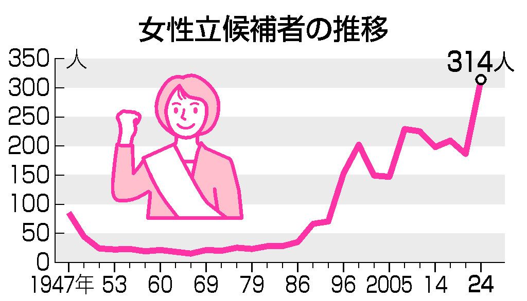 Record-high 314 women filed their candidacy Tuesday for the upcoming general election, while hereditary politics continued to play a large role within the ruling Liberal Democratic Party.