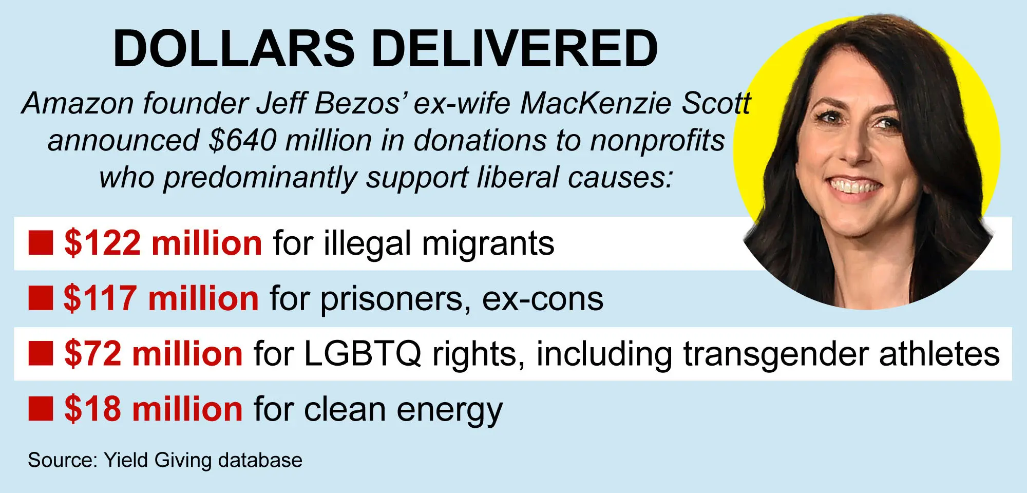 Most of the $640 million in new charitable donations Amazon founder Jeff Bezos’ ex-wife MacKenzie Scott is dishing out will go to nonprofits pushing extreme left-wing causes, including helping migrants who commit crimes and boosting male-born transgender athletes who want to compete against women.