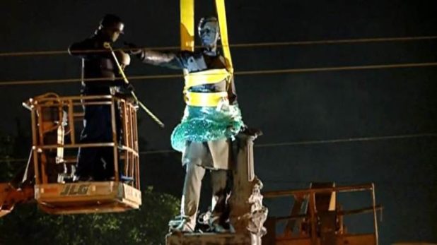 Crews, wearing masks to cover their faces, worked under a heavy police presence starting at 3 a.m. to dismantle the statue, which was erected in 1911, nearly 50 years after the end of the war, and commissioned by the Jefferson Davis Memorial Association. …”
