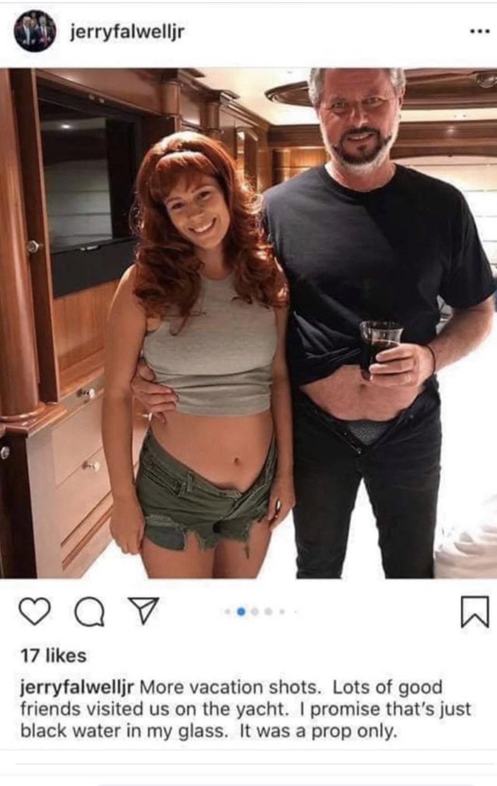 How is this Jerry Falwell Jr. photo even real? Also if you're running the largest Christian university in America maybe don't put photos of yourself on social media with your pants undone on a yacht – with random women in bad wigs. So gross, so hypocritical.