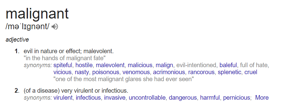 Malignant is one of those big college words. Let’s look up its definition.