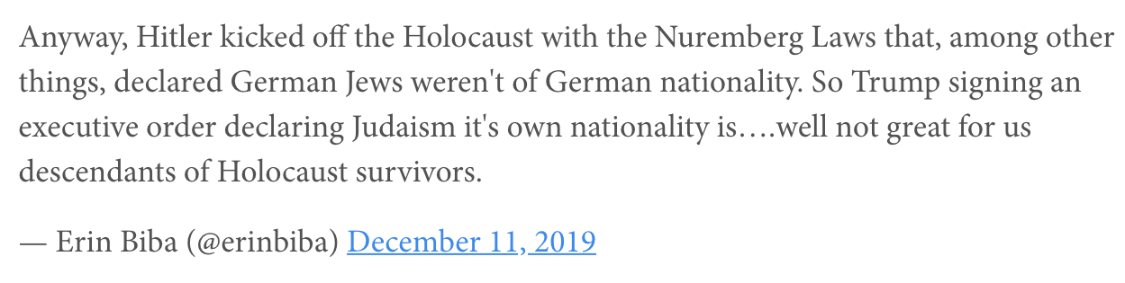 Erin Biba had a Nuremberg Laws meltdown over Trump's anti-Semitism EO but a bunch of Jews get stabbed and she's like "ackshually this is a complicated situation because Jews are bad neighbors." pic.twitter.com/o8b3eSxdIo