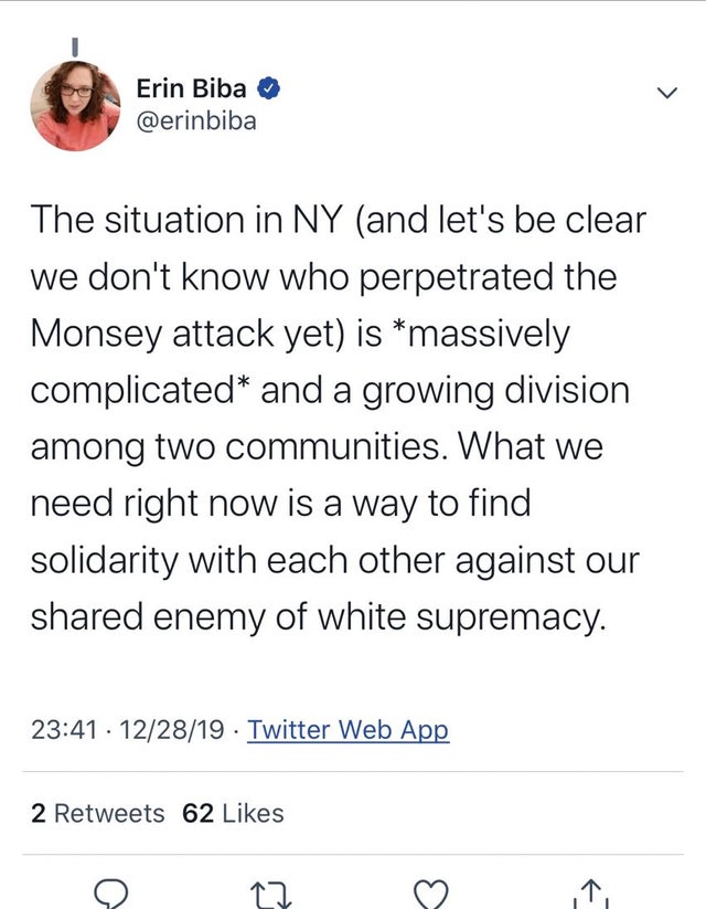 and here’s another “it’s complicated” tweet about the mass stabbing at a Monsey shul from blue checkmark journalist @erinbiba, who is apparently Jewish! pic.twitter.com/N14AsRnnDn