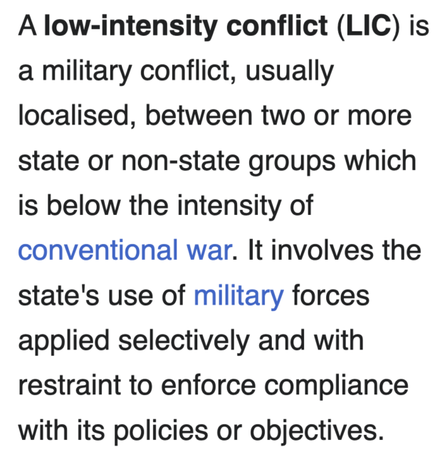 It’s based on “low-intensity warfare,” a piece of US military jargon I first heard in relation to the situation in southern Philippines (where I was living at the time). There were sometimes Islamic (and even communist) shooting events, or kidnappings, or whatever, but although there were military on the streets in villages in Cotabato, it is not to the level of a war.