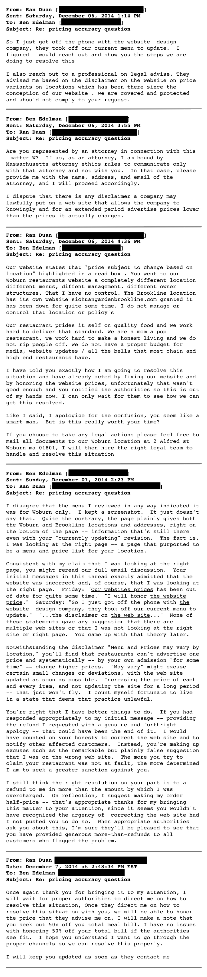A Jew associate professor at Harvard Business School, Benjamin Edelman, ordered $53.35 worth of Chinese food from Sichuan Garden last week. But later this Jew found out he had been Jewed, i.e., he had been overcharged by a paltry $4. Being the noble Jew that he is, he went nuts through an exchange of emails with the restaurant owner, going so far as to threaten legal action.