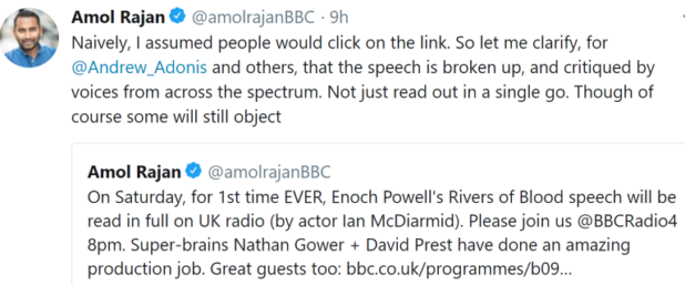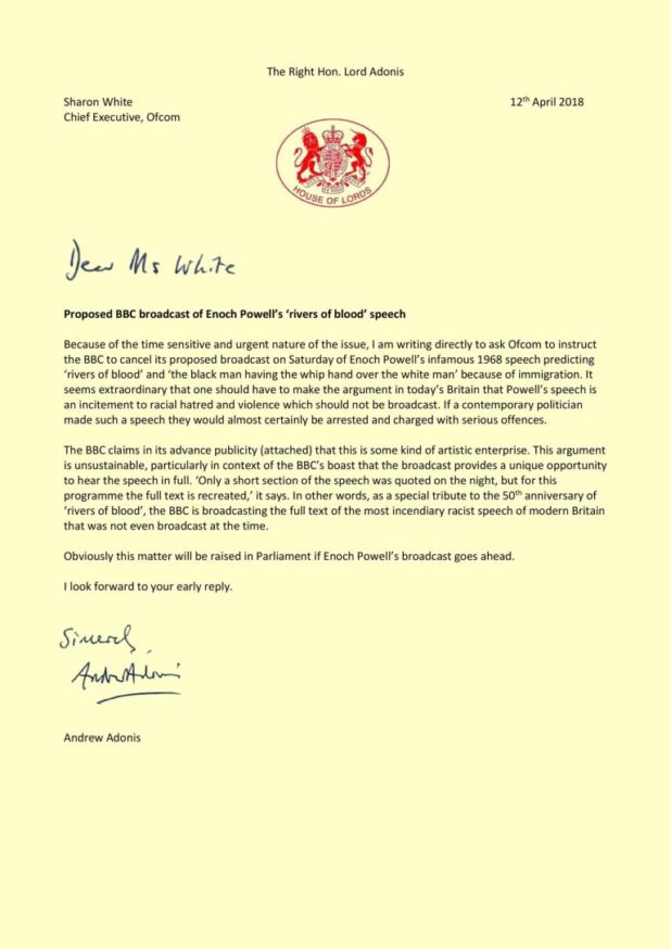 Jew Andrew Adonis has written to broadcasting regulator Ofcom to demand that it “instruct” the BBC not to broadcast Enoch Powell’s Rivers of Blood speech in a radio programme on Saturday.