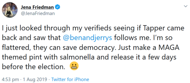 Comedienne Jena Friedman – born into a “conservative Jewish family” – has called for Trump supporters to be poisoned with disease-carrying Ben & Jerry’s ice cream. For maximum effect, she urges that this poisoning take place only a few days before an election.