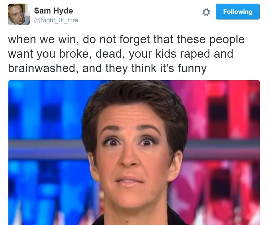 Then, possibly, a crazier than average lefty will take matters into his own hands and attempt something IRL. At which point, if other lefties defend this crazy person’s assassination attempt or whatever, that’s a green light for everybody on their side to go ham, isn’t it?