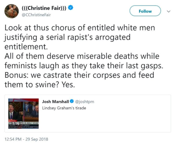 Professor C. Christine Fair tweeted a link to a video of Republican Senator Lindsey Graham speaking in support of Supreme Court nominee Brett Kavanaugh who has been accused of a sexual assault which allegedly took place in 1982 while he was in high school.