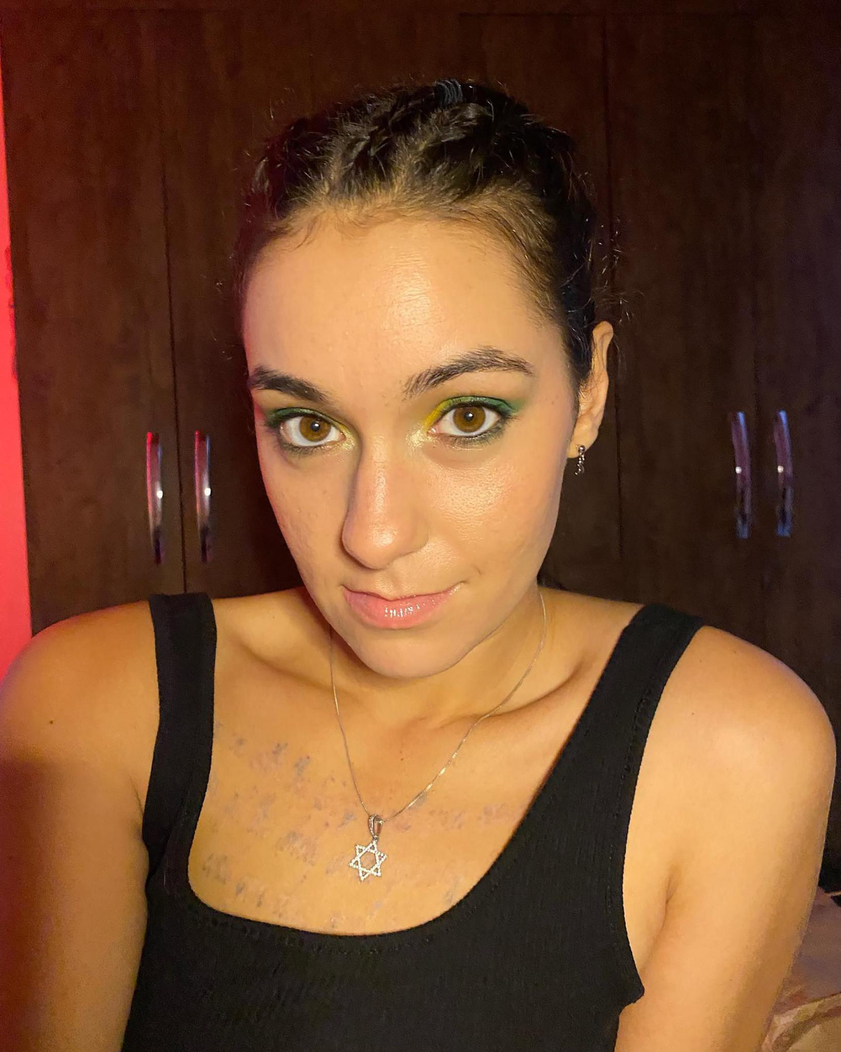 She also appears to have some weird satanic inscriptions on the skin of her chest.