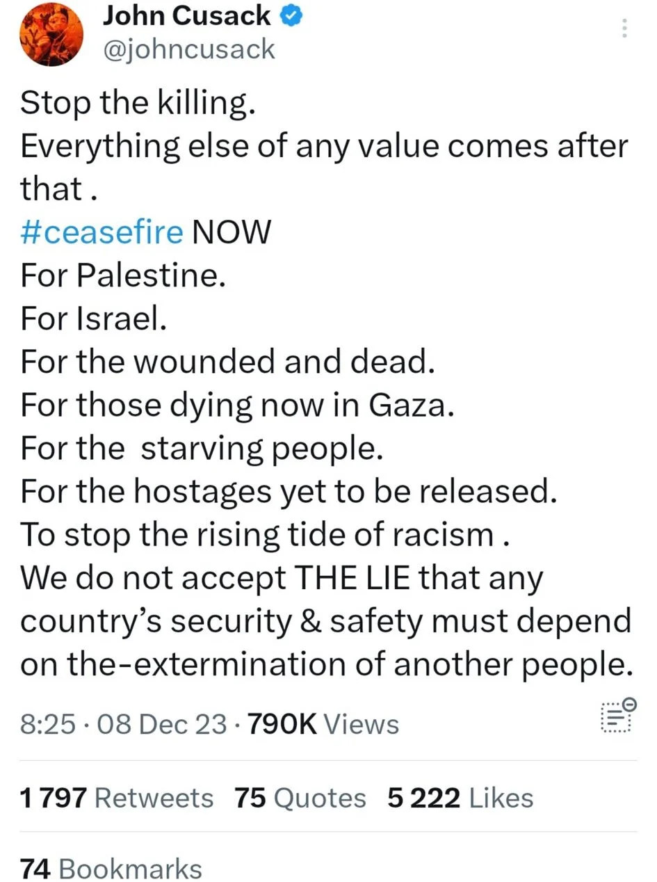 The post went on to tag Cusack’s talent agency asking why they are “repping this bigot,” and concluded with a link to archives and posts from the actor.