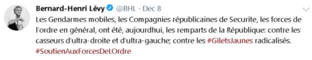 BHL has been gunning hard for the Gilets Jaunes on Twitter and elsewhere, calling them #GiletsBruns [Brown Vests], implying a link with historical fascism.