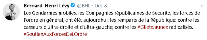 The mobile gendarmes, the CRS [riot police], the forces of order in general, have today been the ramparts of the Republic against the thugs of the far-right and far-left; against the radicalised #GiletsJaunes.