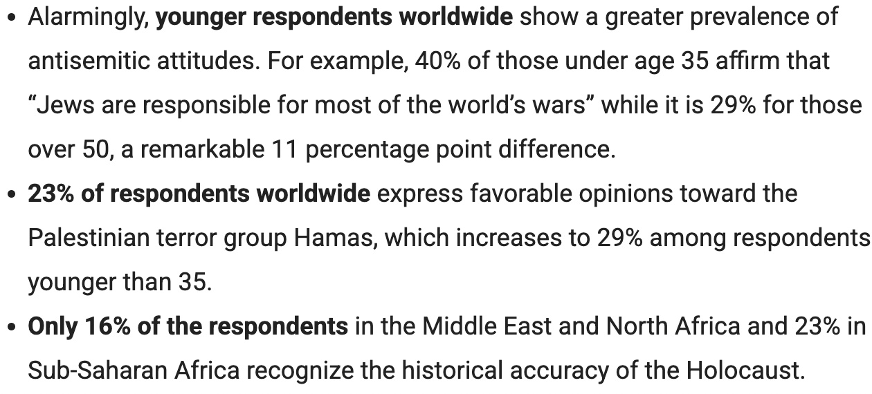 “This is a wake-up call for collective action, and we are committed to continuing our work with our partners around the world to confront and mitigate this deeply ingrained antisemitism.”