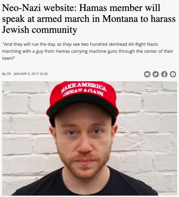 Just imagine – the Jewish Telegraph Agency using the quote “And they will rue the day, as they see two hundred skinhead Alt-Right Nazis marching with a guy from Hamas carrying machine guns through the center of their town!” as a subheading to a completely straightfaced report on how I was going to fly 200 skinheads and Hamas into a small town in Montana to march through the snow – with machine guns!