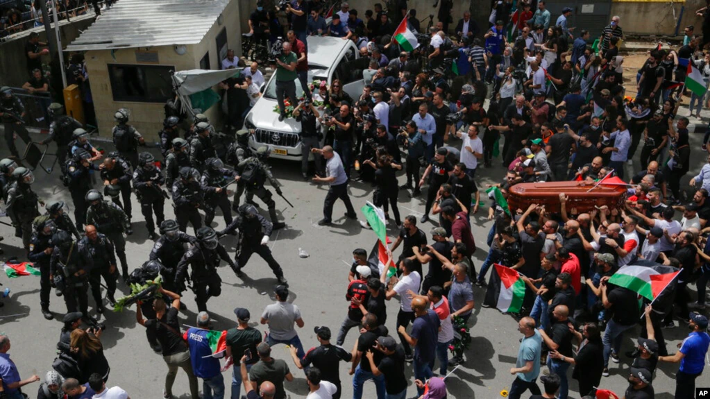 Television footage showed the pallbearers struggling to stop Abu Akleh’s coffin from falling to the ground as baton-wielding police officers charged towards them, grabbing Palestinian flags from mourners.