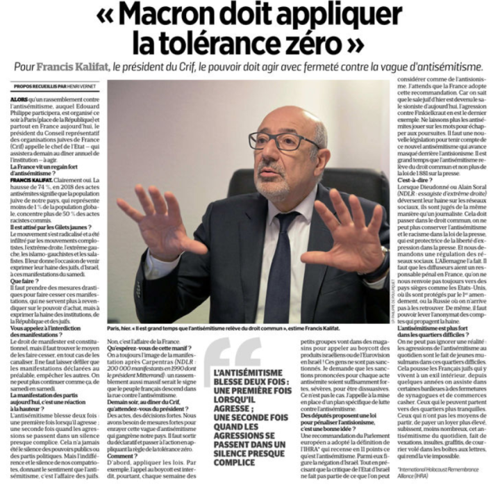 Le Parisien today (19 February) has an interview with Frances Kalifat, president of the CRIF (Representative Council of Jewish Organisations of France), the main Jewish ethno-activist organisation in France. All major French politicians are expected to attend its dinners and pay court to it it, except those of the Front National (now renamed Le Rassemblement National), whom, being defenders of French interests, are systematically excluded.