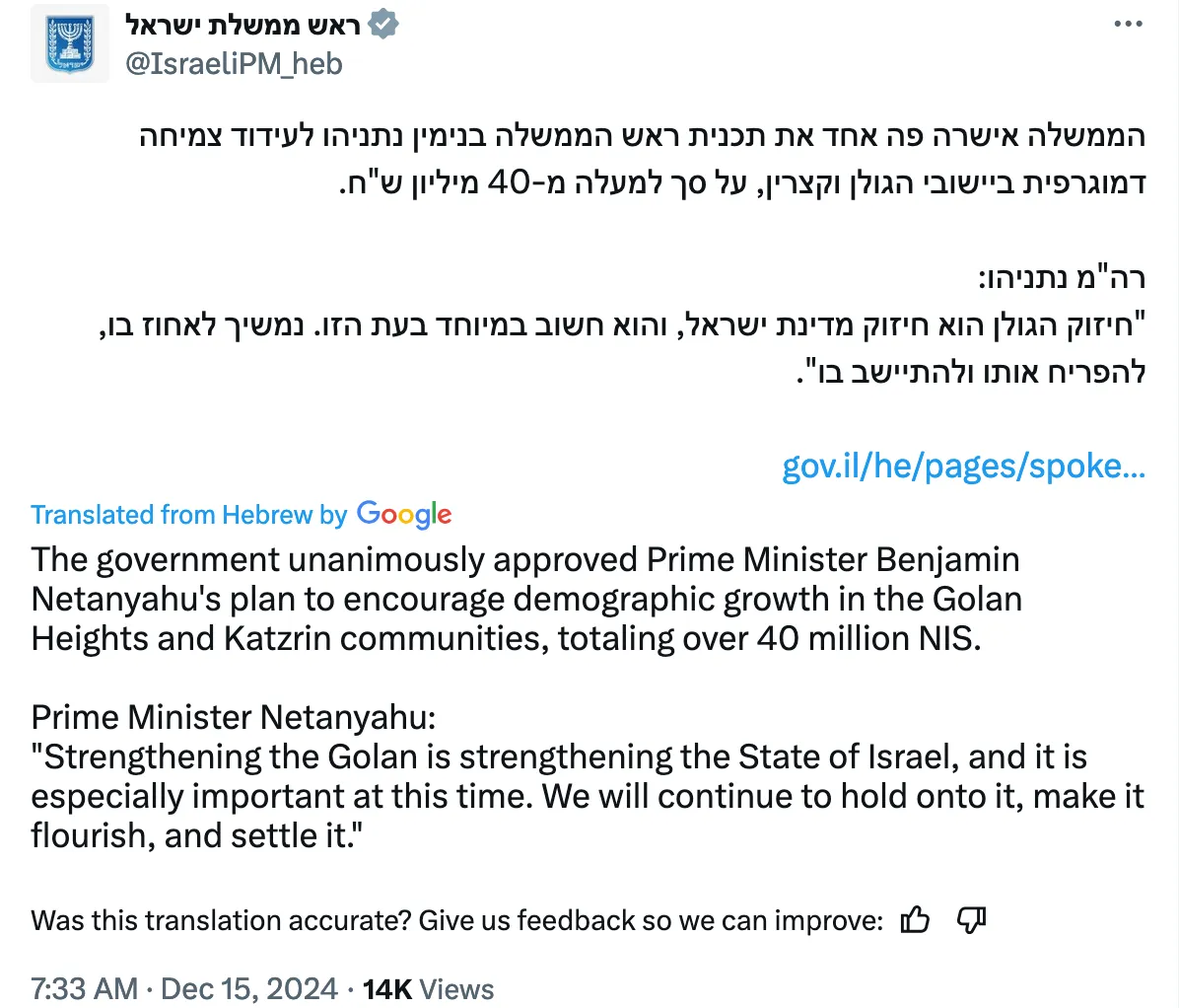 Netanyahu justified his announcement of plans to expand Israeli settlements in the part of the Golan Heights the country initially occupied in 1973 “in light of the war and the new front facing Syria” and a desire to double the Israeli population in the area.