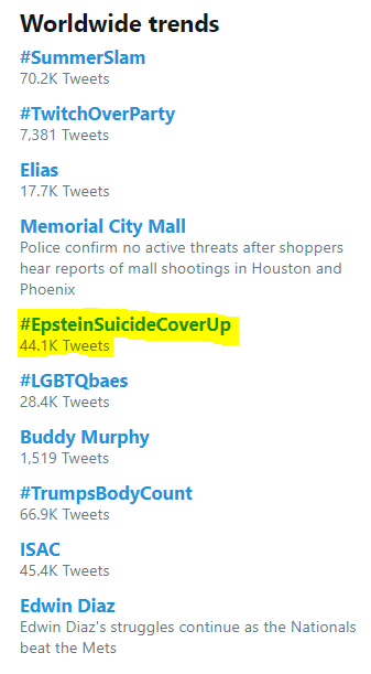 At time of writing the term #EpsteinSuicideCoverUp is a top worldwide trend on Twitter.