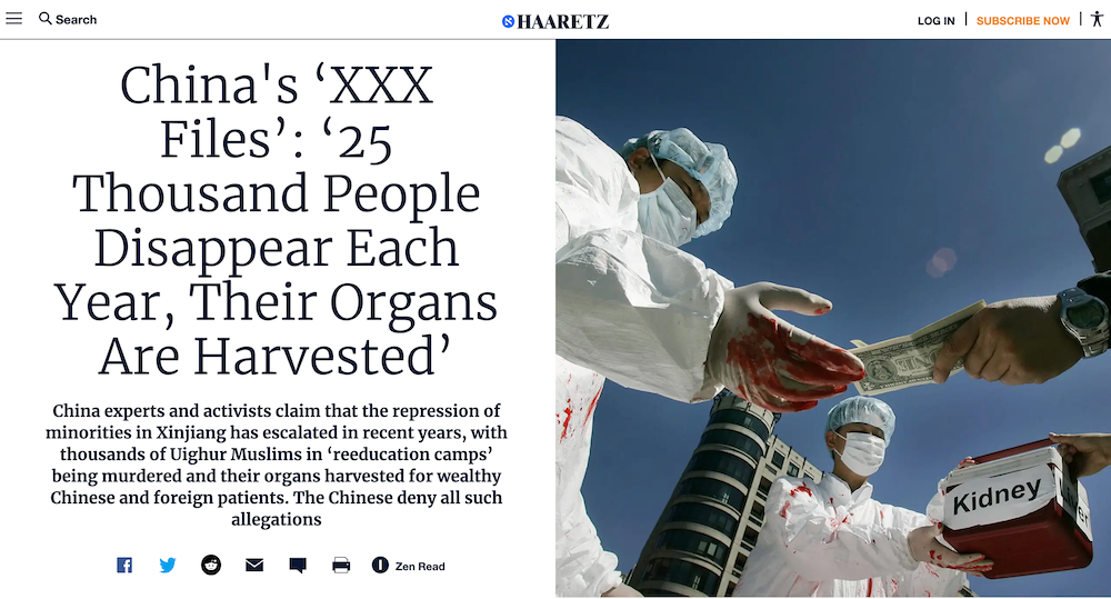 The Israeli paper Haaretz this week ran a 4,500-word article with the headline “China’s ‘XXX Files’: ‘25 Thousand People Disappear Each Year, Their Organs Are Harvested’”
