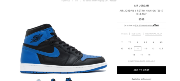 Looks like a company, Affirm, allows stores to offer its services as an option to buy. Once a company has approved Affirm as a method of payment, a customer, who might just be window-shopping for some Air Jordan Fragment 1s or the KAWS Jordan 4s, can see what a monthly rent-to-own payment breakdown might look like.