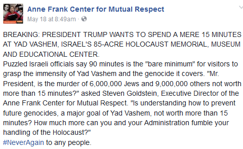 Trump agreed to take time out of his busy five-nation diplomatic tour to placate the critics and go to the museum. But he plans on spending “only” 15 minutes at the blood-libel compound, which Jews are exclaiming proves he’s an anti-Semitic “Holocaust denier”!