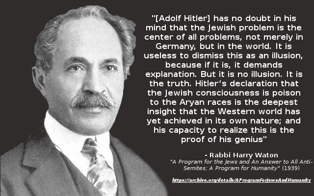 The average person would probably roll their eyes at the above nine statements, due to their indoctrination. I personally believe them to be correct, but they are not entirely my own. Rather they are paraphrased from passages in the 1939 book A Program for the Jews and An Answer to All Anti-Semites; A Program for Humanity, written by a Jewish leader named Rabbi Harry Waton.