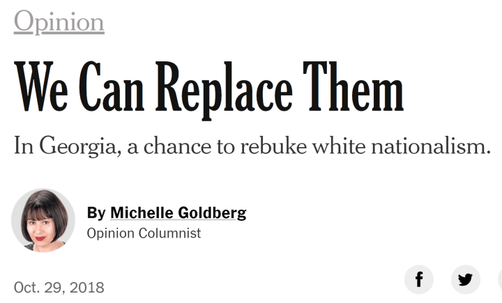 Focusing on the governor’s race in Georgia, the picture she paints of American politics is one of disguised ethnic warfare, where the various candidates and policy positions are simply proxies for underlying racial struggle. Her opening paragraph makes it clear what really makes her feel good about America: the process of dispossessing the people who created it.
