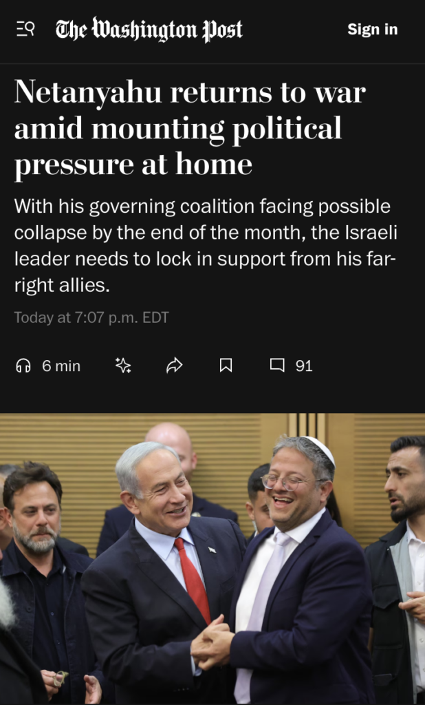 You can go find those on TikTok if you’re interested. The war is back in full swing. Ben-Gvir is back on the team. The whole thing is just up and running again, as if there never was a ceasefire.