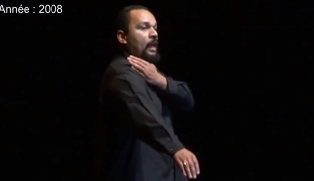 The “quenellle” signal, extending one’s right hand toward the ground while the left hand grasps the shoulder, was devised by Dieudonné M’bala M’bala, a controversial French comedian who has been condemned in court several times for anti-Semitic remarks.