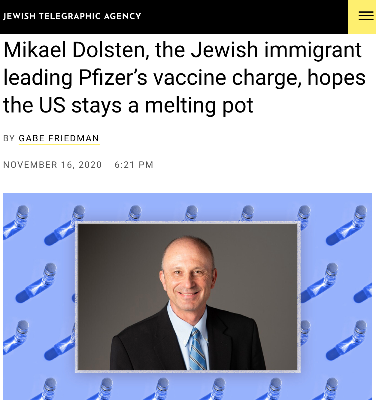 Dolsten, who moved to the New York area from Sweden in 2004, is far from the only Jewish immigrant in his field. In fact, Pfizer CEO Albert Bourla is a Jew from Thessaloniki, Greece. The chief medical officer for Moderna, a competing drugmaker that announced Monday that its COVID-19 vaccine was nearly 95% effective, is an Israeli immigrant named Tal Zaks.