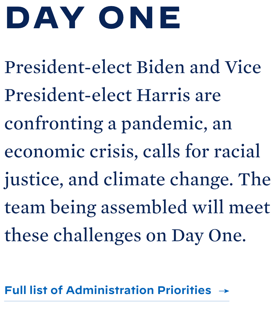On Day One, Biden says he will be dealing with coronavirus, racism and changing the weather.