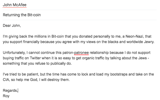 And I’m donating all the “Bit-coin” that he donated personally to me for work I do from the Stormer to an Aryan prison gang because I no longer want anything to do with McAfee’s tainted money.