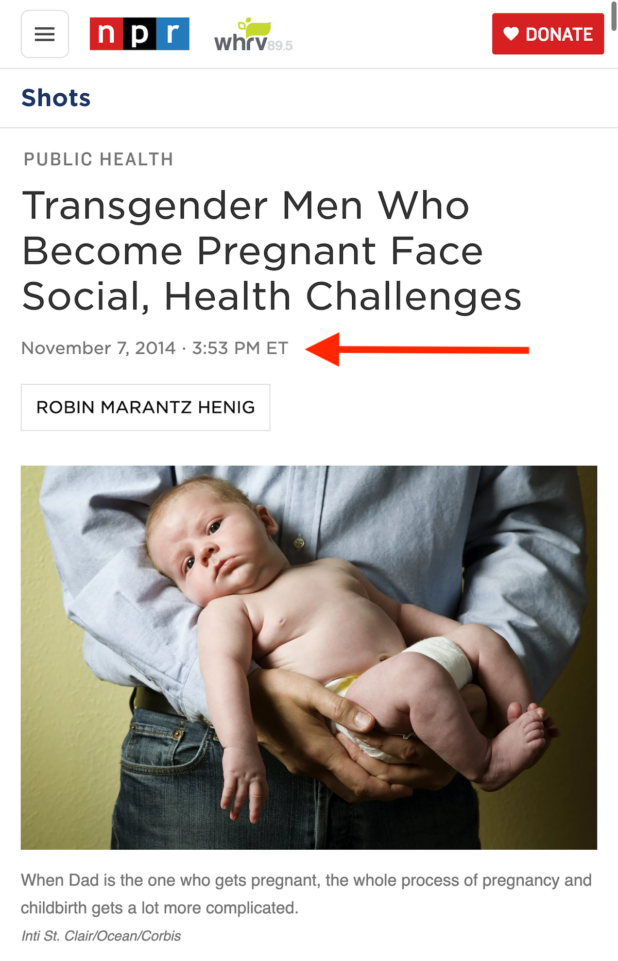 We’ve been tracking “men can get pregnant” type material for nearly two decades, going back to people on 4chan’s /b/ trolling tumblr freaks. But here’s a 2014 article about “pregnant men” on US government sponsored website NPR: