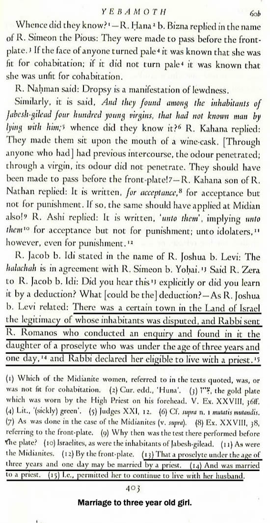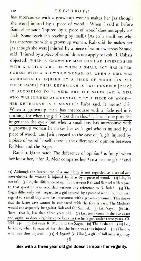Note: in this case, rape of a baby girl under three years is permitted. Such imprecision introduces an important fact: just as the Talmud was flexible concerning age limits of sex, it was also flexible about gender. Footnote 1 to Kethuboth 11b opens a wide door for Jewish homosexual pedophiles by pronouncing “the intercourse of a small boy is not regarded as a sexual act.” (See Judaism and Homosexuality: A Marriage Made in Hell) Pedophile rabbis today, molesting and raping both male and female children, exercise this sociopathic freedom.