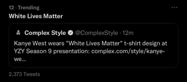 West appeared at his YZY Season 9 fashion show on Monday with Candace Owens – they were wearing matching White Lives Matter T-shirts.