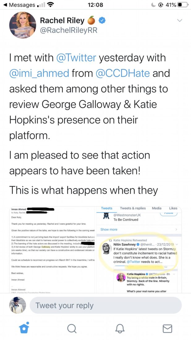 Riley held a meeting with Twitter execs to air her concerns about how some goyim are still able to speak freely on Twitter. She specifically mentioned Katie Hopkins and George Galloway (lefty anti-Zio activist).