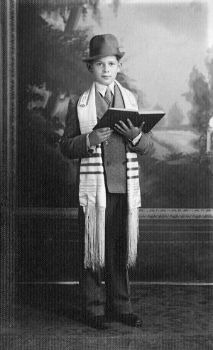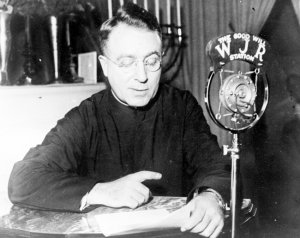 The main thing I notice about this exhibit is that it is totally, 100% about Jews and specifically Jewish concerns. The few non-Jews mentioned are enemies of the Jews. While it starts out saying that by the 1930′s Jews were increasingly comfortable with American ways, it shows nothing about Jews integrating socially with American gentiles and Christians, but only sticking closely with their own kind, their own organizations, their synagogues and businesses. Jews want to be accepted by the majority Gentile culture as “just like them,” but they do not want to participate in the majority Gentile culture, except politically and financially. [Left: Bar Mitzveh Day for Harry Klein] It tells us that Michigan Jews were terribly affected by the war in Europe—the spread of Nazism in Europe brought rising “anti-Semitism” in the U.S, and Michigan was not spared! Evil people like Catholic priest Father Charles Coughlin were openly “anti-Semitic” and 30 million non-Jewish Americans listened to his weekly radio broadcasts. [Shown at right speaking over WJR radio in the 1930s] The exhibit particularly excoriates Father Coughlin simply because he warned about excessive power of the Jews. The exhibit shows that Life and Time magazines, and the powerful Detroit Free Press were all on the side of the Jews against Father Coughlin … so where was the problem? Are we dealing with a real threat or with some kind of Jewish agenda here?