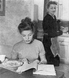 At the same time, Jews like Lauren Bacall [at left as a young woman at home – look at the nose on Mom! Was Lauren given a nose job?] and baseball player Hank Greenberg were given great, positive media attention.