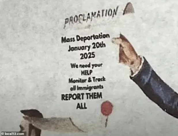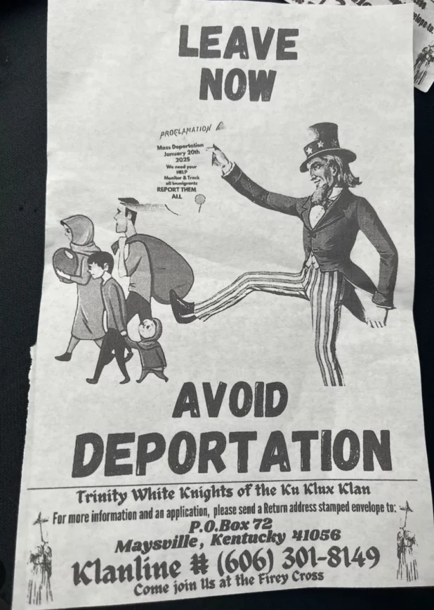 The documents, which include a Kentucky-area phone number and an invitation to “join us”, were distributed on the day Donald Trump took office. The president has repeatedly demonized immigrants and has vowed to launch “the largest deportation program in American history”.