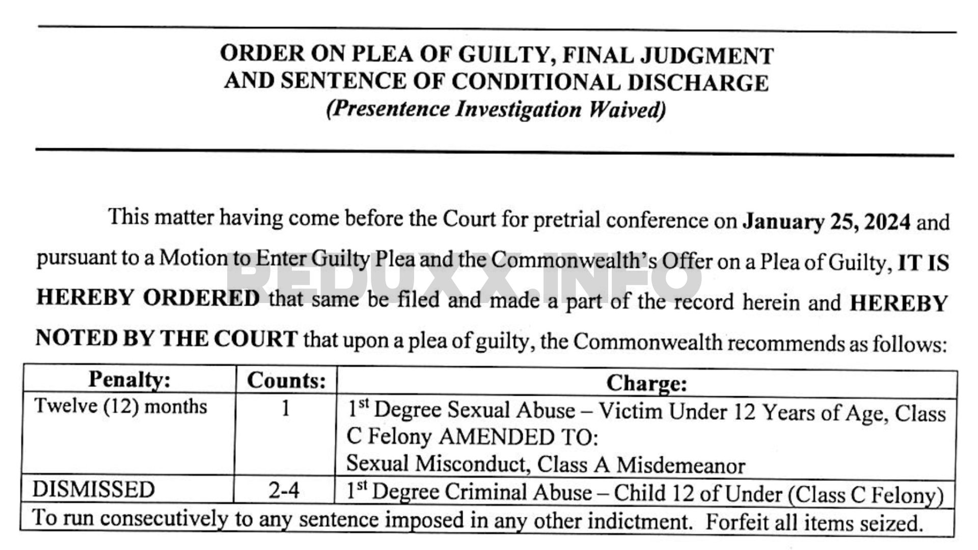 On January 29, 2024, Childers struck an apparent deal with prosecutors. In exchange for a guilty plea, his charge of 1st Degree Sexual Abuse of a Victim Under 12 was amended to Class A Misdemeanor Sexual Misconduct, and the remaining abuse charges were dropped.