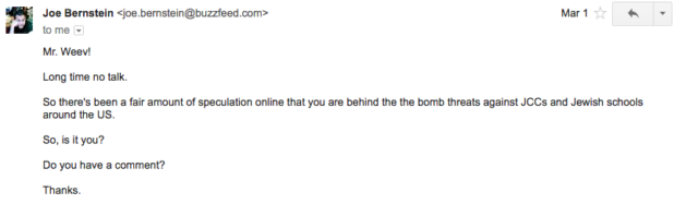 Joe Bernstein, who already tried to interfere with this Daily Stormer’s operations, emailed me to inquire if I was responsible for those threats.