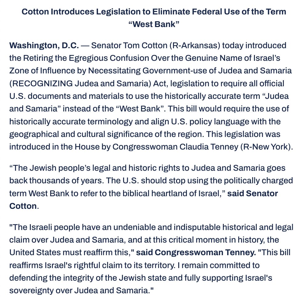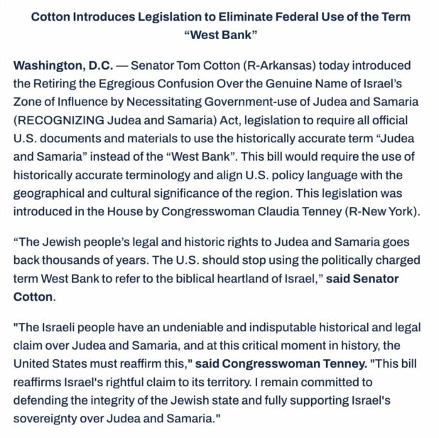 “The Jewish people’s legal and historic rights to Judea and Samaria goes back thousands of years. The U.S. should stop using the politically charged term West Bank to refer to the biblical heartland of Israel,” Cotton said in a statement.