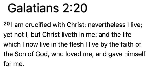 The concept of being crucified with Christ and living only through the spirit of Christ is something that should be pondered deeply. The true self inside of you is one with Christ, and was linked to Christ when you were born, and it is the desires of the flesh that separate you from this true self, this oneness with Christ. But as stated, it is only through death that one can ever truly escape the flesh prison and become one with Christ. Until then, we are all simply doing our best to prepare for that.