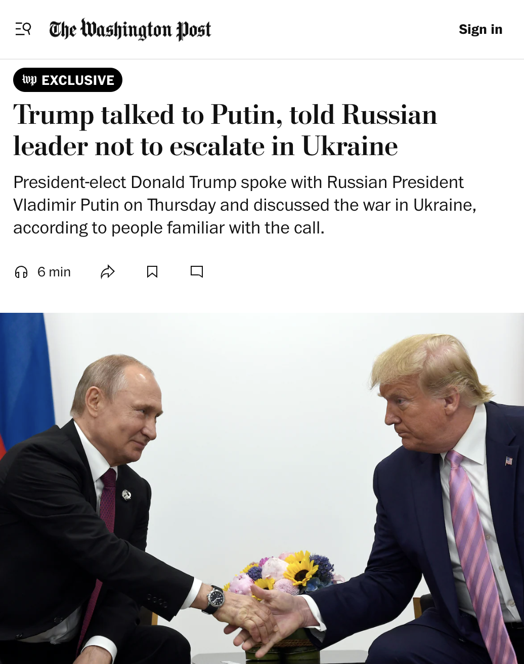 Trump did call Putin, but they did not talk about the Ukraine. The Washington Post either made this up, or, much less plausibly, Trump is giving out fake leaks.