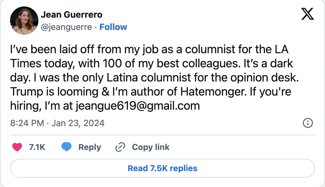 The team behind De Los, a vertical the Times launched in 2023 to cover the city’s 49% Latino population, was gutted. Jeong Park, who was hired to cover Asian American communities in 2022, was also laid off.