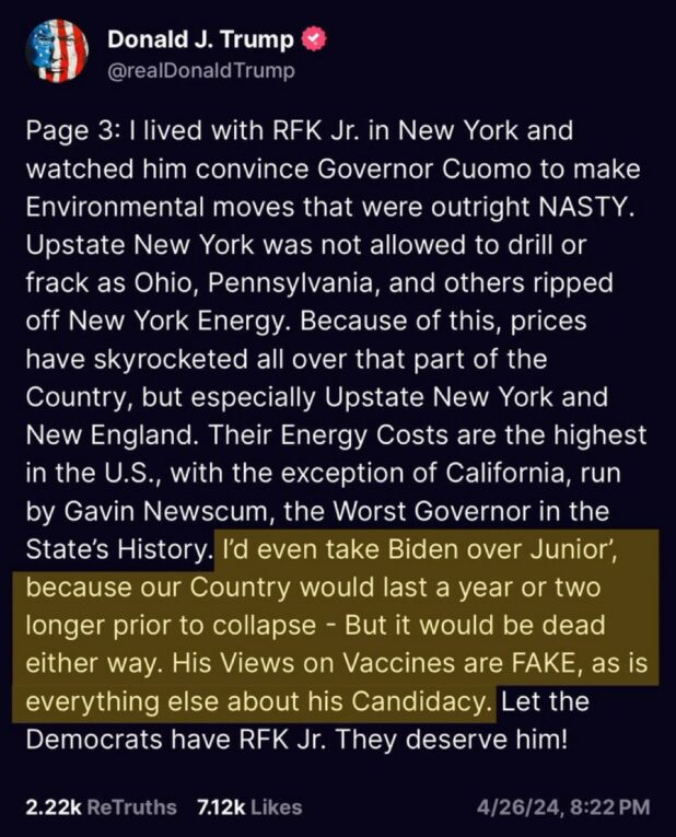 That cocksucker Trump just posted a tweet (fake tweet) attacking RFK Jr. and saying he’s wrong about vaccines.
